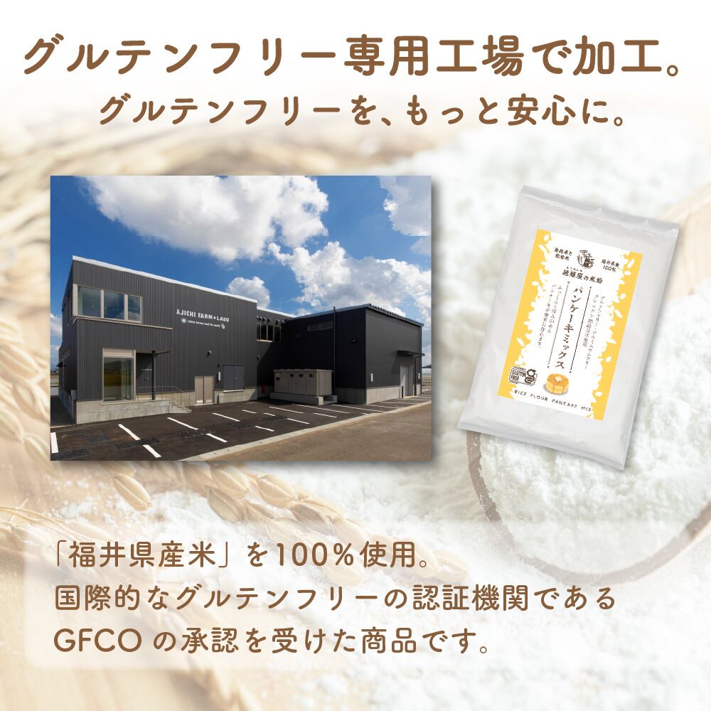 福井県産100%、長粒米と短粒米をバランス良くブレンドしたきめ細かな米粉に砂糖やベーキングパウダーを加え、使いやすいパンケーキミックスに仕上げました。卵と牛乳を加えるだけで、グルテンフリーでふっくらと厚みのあるパンケーキが作れます。