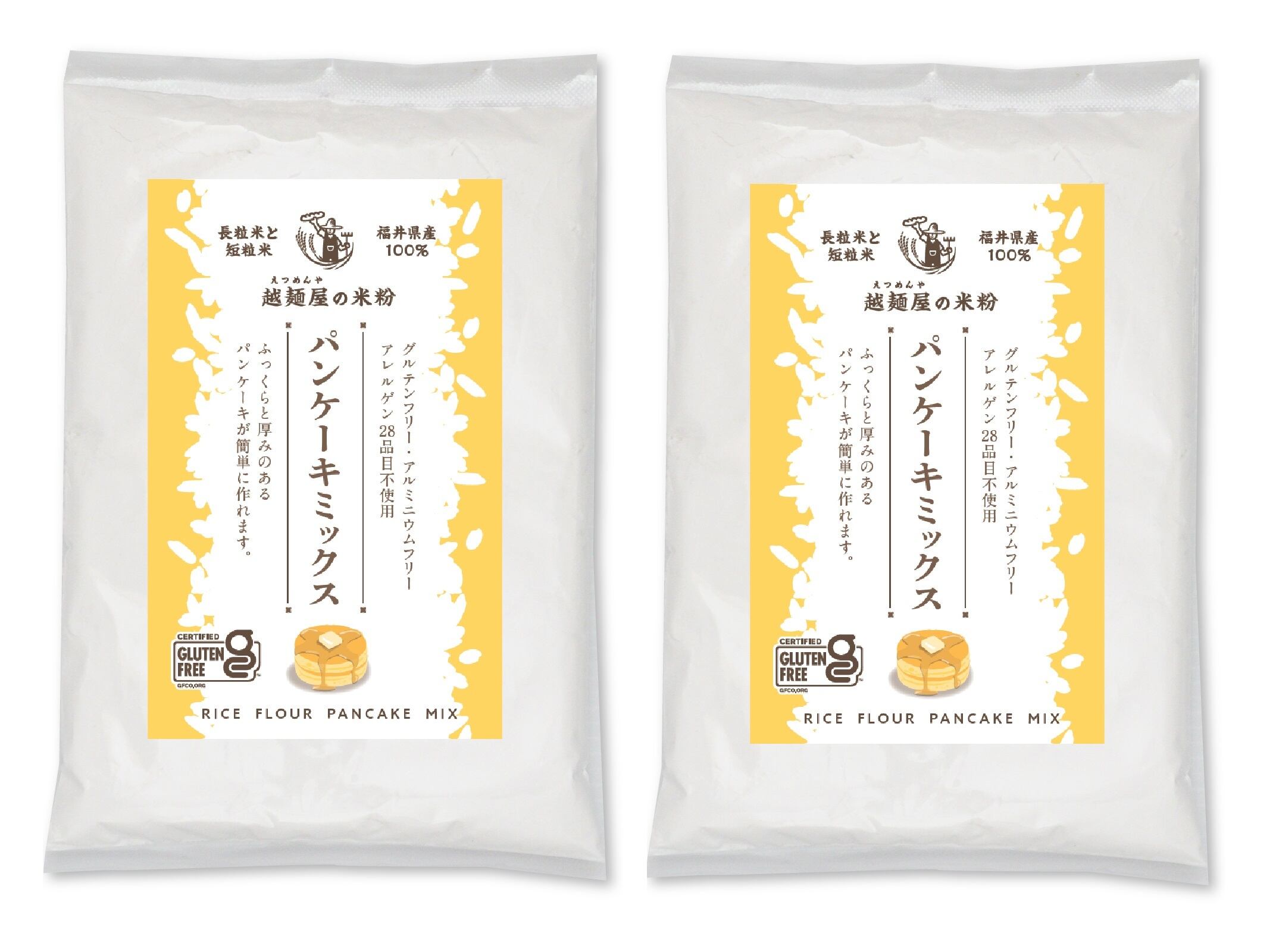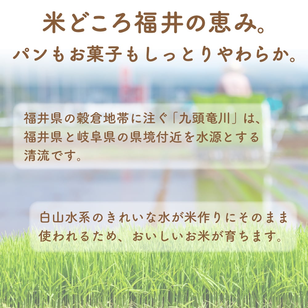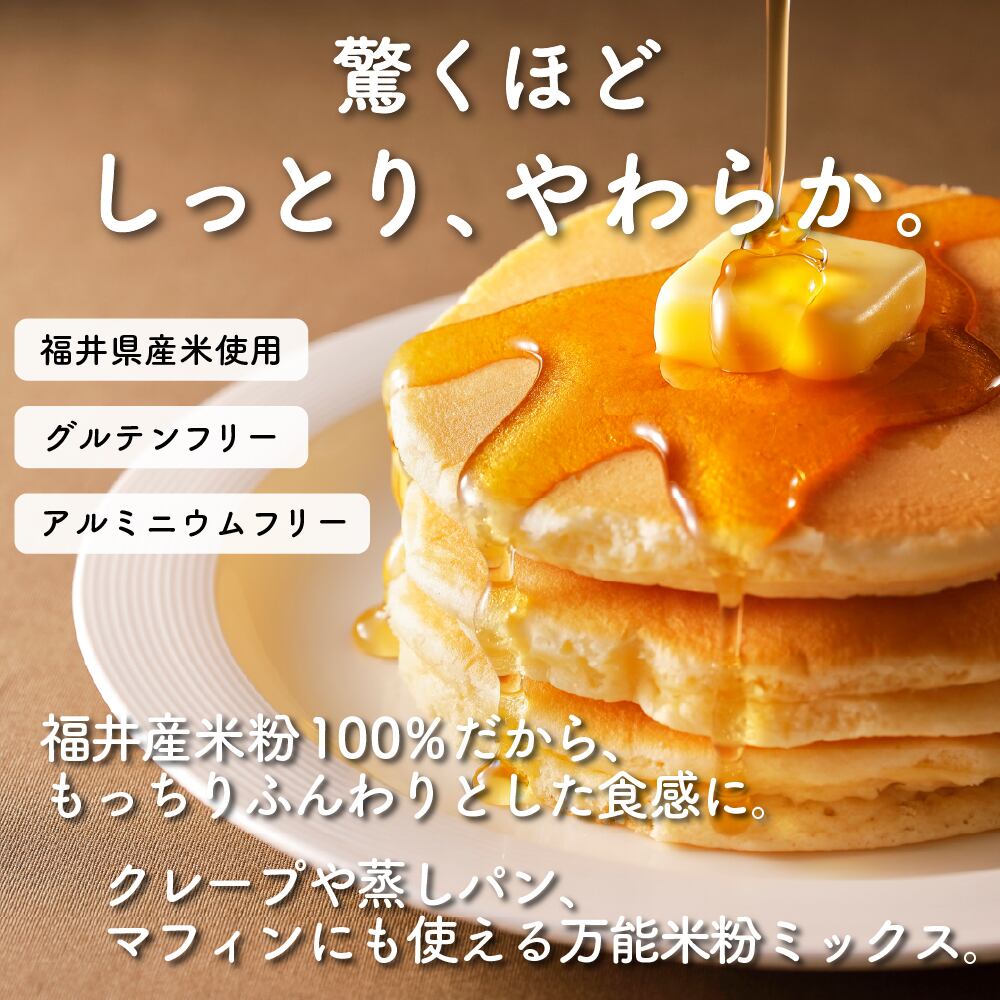 福井県産100%、長粒米と短粒米をバランス良くブレンドしたきめ細かな米粉に砂糖やベーキングパウダーを加え、使いやすいパンケーキミックスに仕上げました。卵と牛乳を加えるだけで、グルテンフリーでふっくらと厚みのあるパンケーキが作れます。