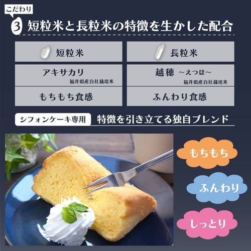 しっとり、もちもち、ふわっふわ。国産の卵と米粉、素材の美味しさを最大限に生かしたシフォンケーキです。口に入れるとしゅわっととろける極上食感と、心ほぐれる優しい味わいをぜひお試しください。紅茶はアールグレイが豊かに香ります。新フレーバーのきなこは京きなこの香ばしい香りが特徴。黒ごまはたっぷりと黒ごまパウダーを配合しています。
